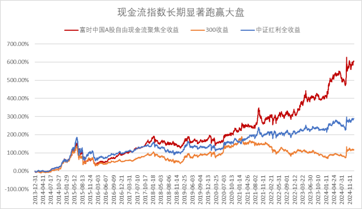 指数业绩来看,以全收益指数(含分红收益)计算,基日(2013/12/31)以来,富时现金流指数年化收益率为20.14%,累计涨幅达602.17%,显著高于沪深300的116.13%和中证红利的287.57%,优势明显。