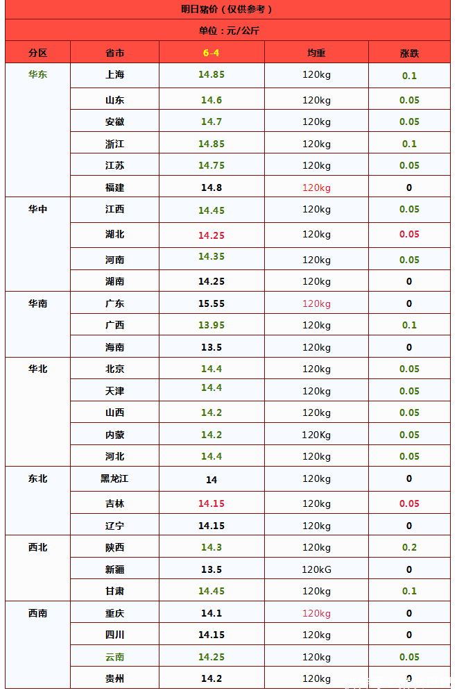 因此,在供需博弈下,预计,6月4日,外三元标猪报价在14.3元/公斤,环比下降0.03元,南北市场以波动下跌为主,短期内,市场或将延续偏弱的局面!重点关注购销格局的变化!